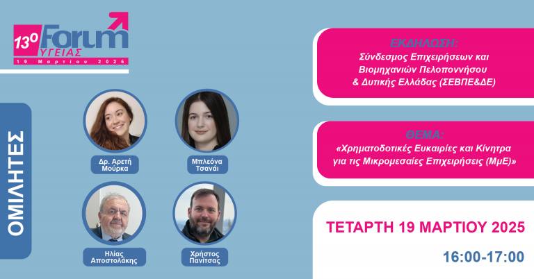 Με θέμα «Χρηματοδοτικές Ευκαιρίες και Κίνητρα για τις Μικρομεσαίες Επιχειρήσεις (ΜμΕ)», ο Σύνδεσμος Επιχειρήσεων και Βιομηχανιών Πελοποννήσου & Δυτικής Ελλάδας (ΣΕΒΠΕ&ΔΕ), στο πλαίσιο υλοποίησης του ευρωπαϊκού προγράμματος smartHEALTH-EDIH, διοργανώνει συνεδριακή εκδήλωση στο πλαίσιο του 13ου Forum Υγείας 2025, την Τετάρτη 19 Μαρτίου 2025, στις 16:00-17:00, στο ξεν. «My Way» (Λεωφ. Όθωνος-Αμαλίας 16, Πάτρα).