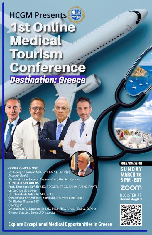 Το 1ο Διαδικτυακό Συνέδριο Ιατρικού Τουρισμού – μία σημαντική πρωτοβουλία του Δρ. Γεωργίου Τσούκα, Προέδρου της Ελληνικής Κοινότητας Μείζονος Μοντρεάλ (ΕΚΜΜ) –  θα διεξαχθεί την Κυριακή 16 Μαρτίου, στις 3:00 μ.μ. (Ώρα Ανατολικού Καναδά). Το συνέδριο αυτό είναι δωρεάν, ανοιχτό στο κοινό, και θα διεξαχθεί διαδικτυακά, επιτρέποντας τη συμμετοχή από όλη τη Βόρεια Αμερική. Οι ενδιαφερόμενοι μπορούν να εγγραφούν εδώ : https://shorturl.at/gq0HX