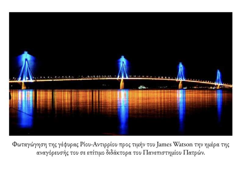 Όταν η Γέφυρα Ρίο Αντίριο “Χαρίλαος Τρικούπης” φωταγωγήθηκε προς τιμήν των κατόχων Nobel James Watson και Jean Marie Lehn προσκεκλημένων του ΜΠΣ Ιατρική Χημεία του Πανεπιστημίου Πατρών.