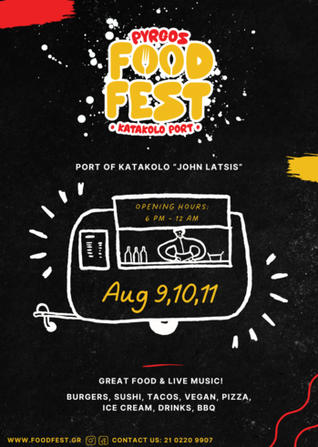 Το 2ο Pyrgos Food Fest θα πραγματοποιηθεί φέτος το τριήμερο 9, 10 και 11 Αυγούστου 2024, στο Λιμάνι του Κατακόλου «Ιωάννης Λάτσης», φέρνοντας μαζί του ένα κύμα γαστρονομικής απόλαυσης και μουσικής διασκέδασης. Μετά την επιτυχία του περσινού Φεστιβάλ, που προσέλκυσε πάνω από 9 χιλιάδες επισκέπτες, το φετινό αναμένεται να είναι ακόμη πιο εντυπωσιακό. Πλούσιο Πρόγραμμα Εκδηλώσεων