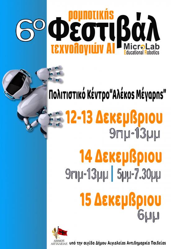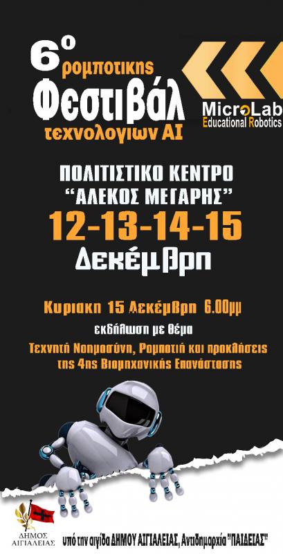 Στο Αίγιο, στις 12, 13, 14 και 15 Δεκεμβρίου 2024, θα πραγματοποιηθεί το 6ο Φεστιβάλ Ρομποτικής και Τεχνολογιών AI που διοργανώνει η MicroLab Robotics.