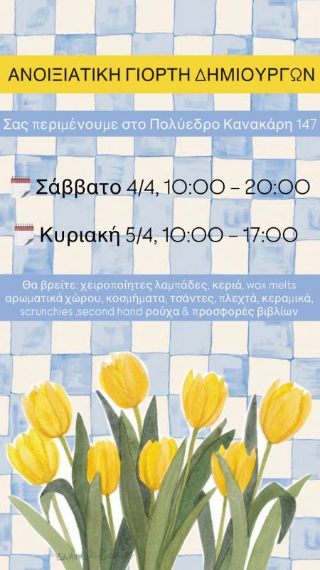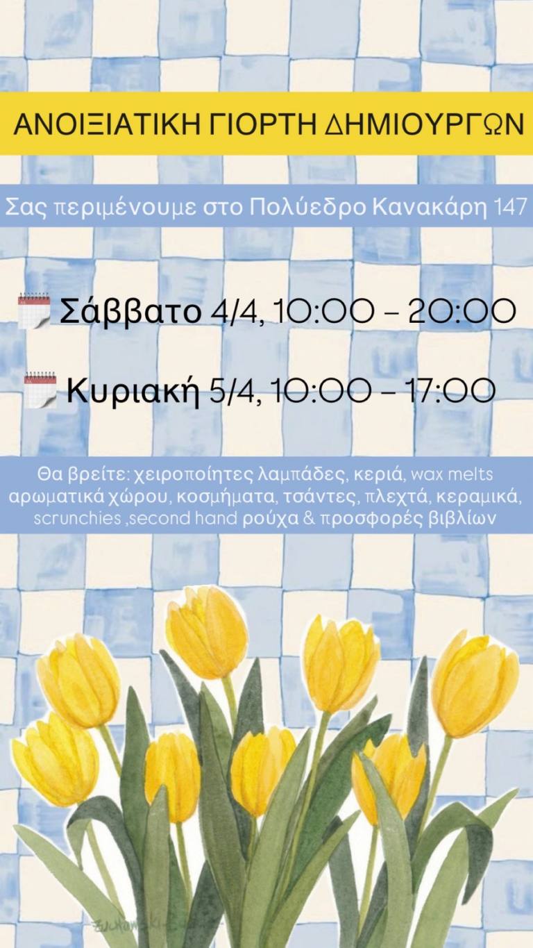 Ανοιξιάτικη Γιορτή Δημιουργών στο Πολύεδρο το Σάββατο 4 Απριλίου, 10 το πρωί με 8 το βράδυ και την Κυριακή 5 Απριλίου, 10 το πρωί με 5 το απόγευμα.  Θα βρείτε χειροποίητες λαμπάδες, κεριά, wax melts, αρωματικά χώρου, κεραμικά, κοσμήματα, τσάντες, πλεχτά, scrunchies, κουκλάκια, σαπούνια, καλλυντικά, second hand ρούχα, προσφορές βιβλίων και πολλές ακόμα χειροποίητες δημιουργίες.