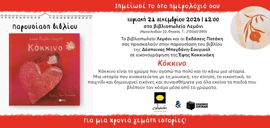 Το βιβλιοπωλείο Λεμόνι και οι Εκδόσεις Πατάκη σας προσκαλούν στην παρουσίαση του βιβλίου της Δέσποινας Μπογδάνη-Σουγιούλ σε εικονογράφηση της Έφης Κοκκινάκη «Κόκκινο»