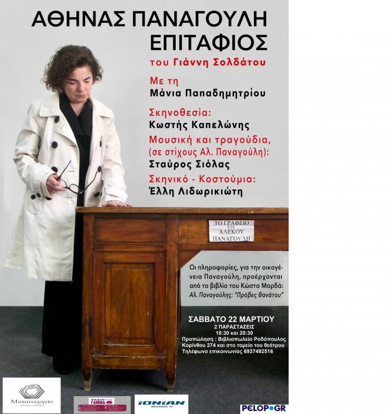 Στο Μηχανουργείο Πολυχώρος Πολιτισμού δύο παραστάσεις του έργου του Γιάννη Σολδάτου “Αθηνάς Παναγούλη, Επιτάφιος”, το Σάββατο 22 Μαρτίου στις 18:30 και στις 20:30,σε σκηνοθεσία Κωστή Καπελώνη, με τη Μάνια Παπαδημητρίου, στο ρόλο της Αθηνάς Παναγούλη.