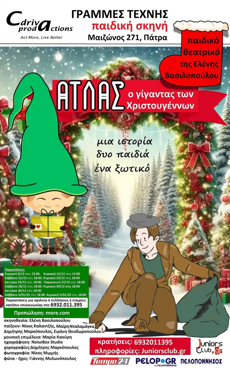 Η Cdriva ProdActions, παρουσιάζει τη Θεατρική παράσταση της Ελένης Βασιλοπούλου «Άτλας, ο γίγαντας των Χριστουγέννων» για την παιδική σκηνή του Θεάτρου ΓΡΑΜΜΕΣ ΤΕΧΝΗΣ (Μαιζώνος 271, έναντι σταθμού τρένου, Πάτρα).