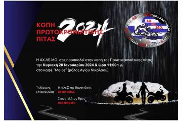 ΑΧ.ΛΕ.ΜΟ. : Κοπή πρωτοχρονιάτικης πίτας στο Cafe Molos Patrinorama Magazine·24 Ιανουαρίου, 2024Η ΑΧ.ΛΕ.ΜΟ (Αχαική Λέσχη Μοτοσυκλετιστών) θα πραγματοποιήσει την κοπή της πρωτοχρονιάτικης πίτας, την Κυριακή 28 Ιανουαρίου στις 11,00...ΑθλητισμόςΔυτική ΕλλάδαΠολιτισμός