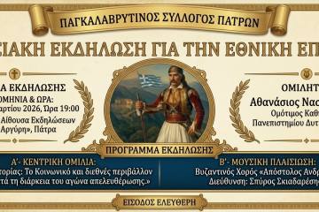 Παγκαλαβρυτινός Σύλλογος Πατρών: Επετειακή Εκδήλωση για την Εθνική Επέτειο της 25ης Μαρτίου 1821 Patrinorama Magazine·19 Μαρτίου, 2026ΠΑΓΚΑΛΑΒΡΥΤΙΝΟΣ ΣΥΛΛΟΓΟΣ ΠΑΤΡΩΝ ΠΡΟΣΚΛΗΣΗ Επετειακή Εκδήλωσηγια την Εθνική Επέτειο της25ης Μαρτίου 1821 Ο Παγκαλαβρυτινός Σύλλογος Πατρών έχει την...Δυτική ΕλλάδαΕΚΔΗΛΩΣΕΙΣΠολιτισμός