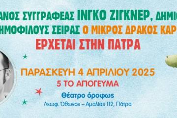 Ο συγγραφέας Ίνγκο Ζίγκνερ την Παρασκευή 4 Απριλίου 2025 έρχεται στην Πάτρα. Patrinorama Magazine·31 Μαρτίου, 2025Το Goethe-Zentrum Patras, η Γωνιά του Βιβλίου – Βιβλιοπωλεία Παπαχρίστου και οι εκδόσεις ΜΕΤΑΙΧΜΙΟ προσκαλούν τους μικρούς τους...Δυτική ΕλλάδαΕΚΔΗΛΩΣΕΙΣΠολιτισμός