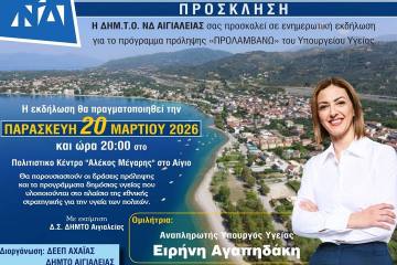 Η Διοικούσα Επιτροπή Εκλογικής Περιφέρειας Αχαΐας της Νέας Δημοκρατίας και η Δημοτική Τοπική Οργάνωση ΝΔ Αιγιαλείας σάς προσκαλούν...