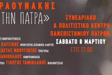 “Τ’Αηδόνια στην Πάτρα” – Σταμάτης Κραουνάκης στο Συνεδριακό και Πολιτιστικό Κέντρο του Πανεπιστημίου Πατρών Patrinorama Magazine·3 Μαρτίου, 2025Τ’ΑΗΔΟΝΙΑ ΣΤΗΝ ΠΑΤΡΑ Πολλά τραγούδια καινούργια και παλιά, του Σταμάτη. Μεγάλες διαχρονικές λαϊκές επιτυχίες που σφράγισαν βράδια και...Δυτική ΕλλάδαΕΚΔΗΛΩΣΕΙΣΠολιτισμός