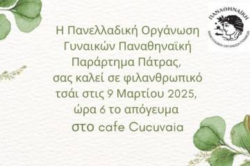 Φιλανθρωπικό τσάι από την Πανελλαδική Οργάνωση Γυναικών «Παναθηναϊκή» Παράρτημα Πάτρας Patrinorama Magazine·3 Μαρτίου, 2025Οι Γυναίκες στην Πανελλαδική Οργάνωση Γυναικών ΠΑΝΑΘΗΝΑΙΚΗ, Παράρτημα Πάτρας, γιορτάζουν με φιλανθρωπικό τσάι που θα προσφέρουν, για την...Δυτική ΕλλάδαΕΚΔΗΛΩΣΕΙΣ