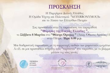 Παρουσίαση του εικονογραφημένου παραμυθιού “Θύμησες της Γιαγιάς Ελλάδας” στο Θέατρο “Οροφως” Patrinorama Magazine·3 Μαρτίου, 2025Έχουμε την χαρά και την τιμή να σας προσκαλέσουμε στην παρουσίαση του εικονογραφημένου παραμυθιού με τίτλο ” Θύμησες...ΕΚΔΗΛΩΣΕΙΣΠολιτισμός