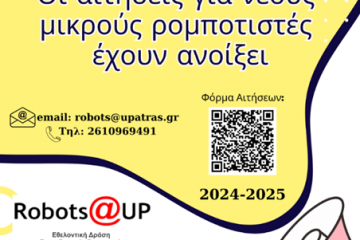 Εισαγωγή νέων μικρών ρομποτιστών στην εθελοντική δράση εκπαιδευτικής ρομποτικής Robots@UP Patrinorama Magazine·18 Φεβρουαρίου, 2025Η εθελοντική δράση εκπαιδευτικής ρομποτικής του Πανεπιστημίου Πατρών, Robots@UP, για ακόμη μία χρονιά, ανοίγει τις πόρτες της για...Δυτική ΕλλάδαΕΚΔΗΛΩΣΕΙΣ