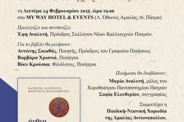 Παρουσίαση της ποιητικής συλλογής της Κατερίνας Λιάτζουρα “Άνθεα, εγχώρια και εξωτικά” στην Πάτρα Patrinorama Magazine·18 Φεβρουαρίου, 2025Ο Σύλλογος Νέων Καλλιτεχνών Πάτρας και οι ΑΩ Εκδόσεις σας προσκαλούν στην παρουσίαση της ποιητικής συλλογής της Κατερίνας...ΕΚΔΗΛΩΣΕΙΣΠολιτισμός