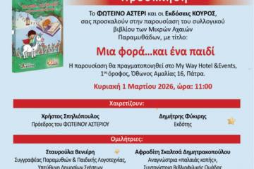 Παρουσίαση του συλλογικού βιβλίου των Μικρών Αχαιών Παραμυθάδων «Μια φορά… και ένα παιδί» στο My Way Hotel Patrinorama Magazine·21 Φεβρουαρίου, 2026Με ιδιαίτερη χαρά,το Φωτεινό Αστέρι και οι Εκδόσεις ΚΟΥΡΟΣ σας προσκαλούν στην παρουσίαση του συλλογικού βιβλίου των Μικρών...Δυτική ΕλλάδαΕΚΔΗΛΩΣΕΙΣΠολιτισμός