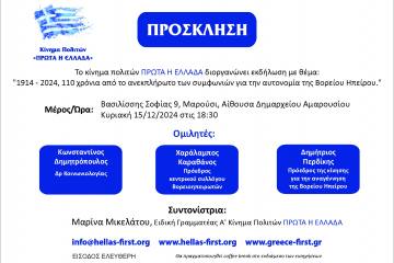 Εκδήλωση για το Βορειοηπειρωτικό 15/12/2024 – Κίνημα Πολιτών ΠΡΩΤΑ Η ΕΛΛΑΔΑ Patrinorama Magazine·10 Δεκεμβρίου, 2024Το «Κίνημα πολιτών ΠΡΩΤΑ Η ΕΛΛΑΔΑ» θα πραγματοποιήσει την Κυριακή 15 Δεκεμβρίου στις 18:30 εκδήλωση στην αίθουσα του Δημαρχείου Αμαρουσίου, στην οδό Βασιλίσσης Σοφίας 9, με θέμα:...ΕΚΔΗΛΩΣΕΙΣΕλλάδα