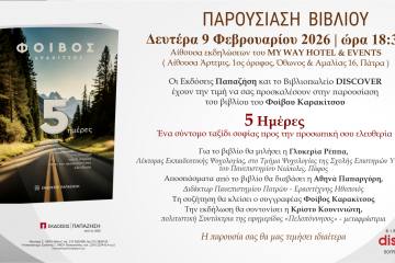Παρουσίαση βιβλίου “5 Ημέρες Ένα σύντομο ταξίδι σοφίας προς την προσωπικη ελευθερία” του Φοίβου Καρακίτσου στο My Way Hotel Patrinorama Magazine·3 Φεβρουαρίου, 2026Οι Εκδόσεις Παπαζήση και το Βιβλιοπωλείο Discoverέχουν την τιμή να σας προσκαλέσουν στην παρουσίαση του βιβλίου του Φοίβου...Δυτική ΕλλάδαΕΚΔΗΛΩΣΕΙΣΠολιτισμός