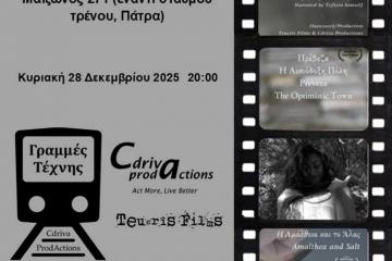 Κινηματογραφικές προβολές στις Γραμμές Τέχνης την Κυριακή 28 Δεκεμβρίου Patrinorama Magazine·26 Δεκεμβρίου, 2025Η Cdriva ProdActions και η Teucris Films, προβάλλουν έξι βραβευμένες ταινίες μικρού και μεσαίου μήκους του Τεύκρου Σακελλαρόπουλου...Δυτική ΕλλάδαΕΚΔΗΛΩΣΕΙΣΠολιτισμός