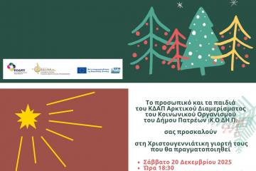 Χριστουγεννιάτικη γιορτή του ΚΔΑΠ Αρκτικού του Δήμου Πατρέων το Σάββατο 20 Δεκεμβρίου Patrinorama Magazine·18 Δεκεμβρίου, 2025ΚΔΑΠ ΑΡΚΤΙΚΟΥ – ΠΡΟΣΚΛΗΣΗ ΧΡΙΣΤΟΥΓΕΝΝΙΑΤΙΚΗΣ ΓΙΟΡΤΗΣ – 20/12/2025 ΠΡΟΣΚΛΗΣΗ Το προσωπικό και τα παιδιά του ΚΔΑΠ Αρκτικού Διαμερίσματος...Δυτική ΕλλάδαΕΚΔΗΛΩΣΕΙΣΠολιτισμός