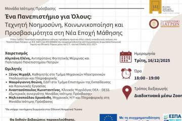Διαδικτυακό Σεμινάριο: «Ένα Πανεπιστήμιο για Όλους: Τεχνητή Νοημοσύνη, Κοινωνικοποίηση και Προσβασιμότητα στη νέα εποχή μάθησης» Patrinorama Magazine·13 Δεκεμβρίου, 2025Διαδικτυακό Σεμινάριο: «Ένα Πανεπιστήμιο για Όλους: Τεχνητή Νοημοσύνη, Κοινωνικοποίηση και Προσβασιμότητα στη νέα εποχή μάθησης» Η Μονάδα Ισότιμης...Δυτική ΕλλάδαΕΚΔΗΛΩΣΕΙΣ