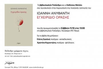 Παρουσίαση ποιητικής συλλογής «Εγχειρίδιο όρασης» του Ιωάννη Ανυφαντή στο Πολύεδρο Patrinorama Magazine·2 Οκτωβρίου, 2025Παρουσιάζεται στο Πολύεδρο, το Σάββατο 11 Οκτωβρίου, στη 1 το μεσημέρι, η ποιητική συλλογή «Εγχειρίδιο όρασης» του Ιωάννη...ΕΚΔΗΛΩΣΕΙΣΠολιτισμός