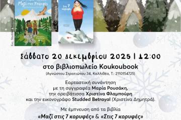 Αθήνα: Εορταστική συνάντηση των Εκδόσεων Πατάκη με τη συγγραφέα Μαρία Ρουσάκη και τη Χριστίνα Φλαμπούρη στο βιβλιοπωλείο Koukoubook Patrinorama Magazine·18 Δεκεμβρίου, 2025Σάββατο 20 Δεκεμβρίου 2025 | 12:00 στο βιβλιοπωλείο Koukoubook (Αγνώστου Στρατιώτου 34, Καλλιθέα, Τ.: 2110154725) Το βιβλιοπωλείο Koukoubook...ΕΚΔΗΛΩΣΕΙΣΕλλάδαΠολιτισμός