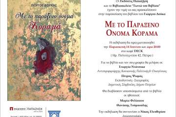 Παρουσίαση του βιβλίου του Γιώργου Δούκα “ΜΕ ΤΟ ΠΑΡΑΞΕΝΟ ΟΝΟΜΑ ΚΟΡΑΜΑ” την Παρασκευή 14 Ιουνίου Patrinorama Magazine·11 Ιουνίου, 2024Οι Eκδόσεις Παπαζήση και το Βιβλιοπωλείο Παπαχρίστου-«Γωνιά του Βιβλίου» έχουν την τιμή να σας προσκαλέσουν στην παρουσίαση του...Δυτική ΕλλάδαΠαρουσιάσεις