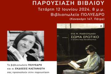 Παρουσίαση βιβλίου της Εύας Μαθιουδάκη “Σώμα ερωτικό, η ιστορία μιας μεταφράστριας” στο Πολύεδρο Patrinorama Magazine·8 Ιουνίου, 2024Παρουσιάζεται στον κήπο του Πολύεδρου, την Τετάρτη 12 Ιουνίου, στις 8 το βράδυ το βιβλίο «Σώμα ερωτικό, η...Δυτική ΕλλάδαΠαρουσιάσειςΠολιτισμός