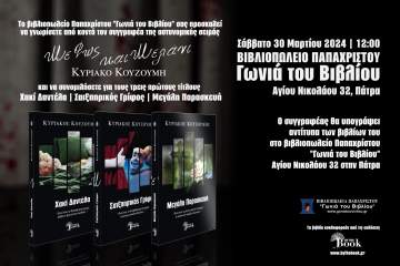 Ο ταλαντούχος συγγραφέας Κυριάκος Κουζουμης υπογράφει τα βιβλία του στη ΓΩΝΙΑ ΤΟΥ ΒΙΒΛΙΟΥ – ΠΑΠΑΧΡΙΣΤΟΥ το Σάββατο 30 Μαρτίου 2024 Patrinorama Magazine·22 Μαρτίου, 2024Το βιβλιοπωλείο Παπαχρίστου -Γωνιά του Βιβλίου σας προσκαλεί να γνωρίσετε από κοντά τον συγγραφέα της νέας αστυνομικής σειράς...Δυτική ΕλλάδαΠαρουσιάσεις
