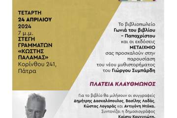 Παρουσίαση του νέου μυθιστορήματος του Γιώργου Συμπάρδη «Πλατεία Κλαυθμώνος» την Τετάρτη 24 Απριλίου στην Πάτρα Patrinorama Magazine·23 Απριλίου, 2024Παρουσίαση του νέου μυθιστορήματος του Γιώργου Συμπάρδη «Πλατεία Κλαυθμώνος». Το βιβλιοπωλείο Γωνιά του βιβλίου – Παπαχρίστου και οι...ΠαρουσιάσειςΠολιτισμός