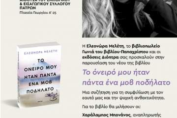 Η Ελεονώρα Μελέτη παρουσιάζει στην Πάτρα το νέο της βιβλίο “Το όνειρό μου ήταν πάντα ένα μοβ ποδήλατο” Patrinorama Magazine·23 Μαΐου, 2024Η επιτυχημένη δημοσιογράφος και παρουσιάστρια Ελεονώρα Μελέτη παρουσιάζει στην Πάτρα το νέο της βιβλίο «Το όνειρό μου ήταν...Δυτική ΕλλάδαΠαρουσιάσεις