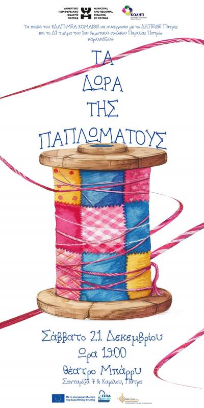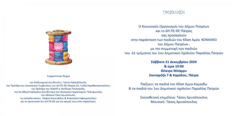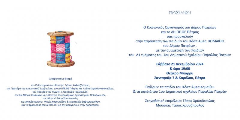 Ο Κοινωνικός Οργανισμός του Δήμου Πατρέων και το ΔΗ.ΠΕ.ΘΕ. Πάτρας σας προσκαλούν στην παράσταση των παιδιών του ΚΔΑΠ ΑΜΕΑ ΚΟΜΑΙΘΩ του Δήμου Πατρέων με τη συμμετοχή των παιδιών του Δ1 τμήματος του 1ου Δημοτικού Σχολείου Παραλίας Πατρών το Σάββατο 21 Δεκεμβρίου στις 19.00 στο Θέατρο Μπάρρυ (Σανταρόζου 7 και Καρόλου, Πάτρα).