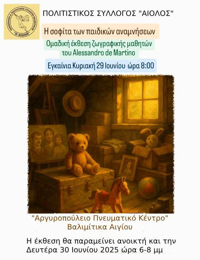 Καλλιτεχνική εκδήλωση με θέμα <<Η σοφίτα των παιδικών αναμνήσεων>>, πραγματοποιείται, την Κυριακή 29 Ιουνίου 2025 στις 20:00, στο Αργυροπούλειο Πνευματικό Κέντρο, στα Βαλιμίτικα Αιγίου.