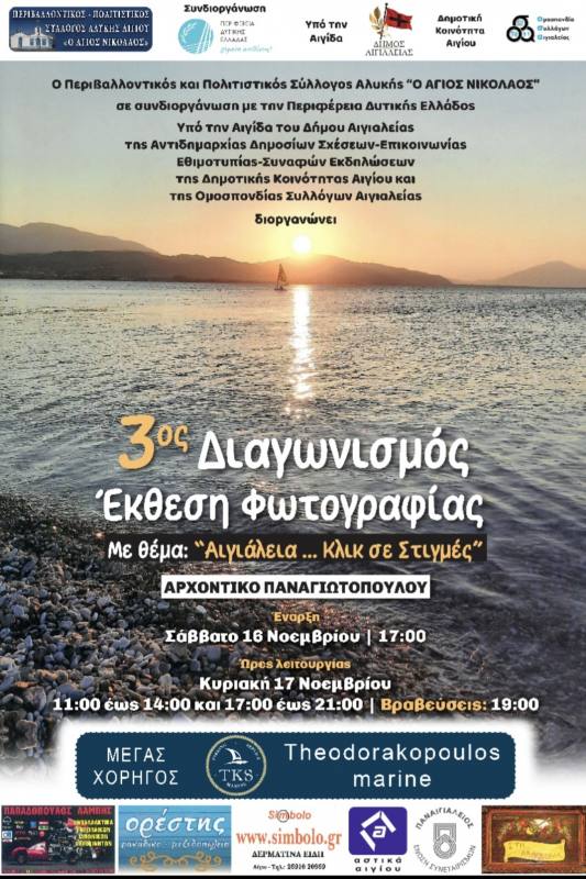 Ο Περιβαλλοντικός και Πολιτιστικός Σύλλογος Αλυκής “Ο ΑΓΙΟΣ ΝΙΚΟΛΑΟΣ” , σε συνδιοργάνωση με την Περιφέρεια Δυτικής Ελλάδας και Αιγιαλείας και υπό την Αιγίδα του Δήμου Αιγιαλείας, της Αντιδημαρχίας Δημοσίων Σχέσεων-Επικοινωνίας-Εθιμοτυπίας-Συναφών Εκδηλώσεων του Δήμου Αιγιαλείας, της Δημοτικής Κοινότητας Αιγίου, διοργανώνει τον 3ο Διαγωνισμό – Έκθεση φωτογραφίας με θέμα: “Αιγιάλεια… Κλικ σε Στιγμές”.