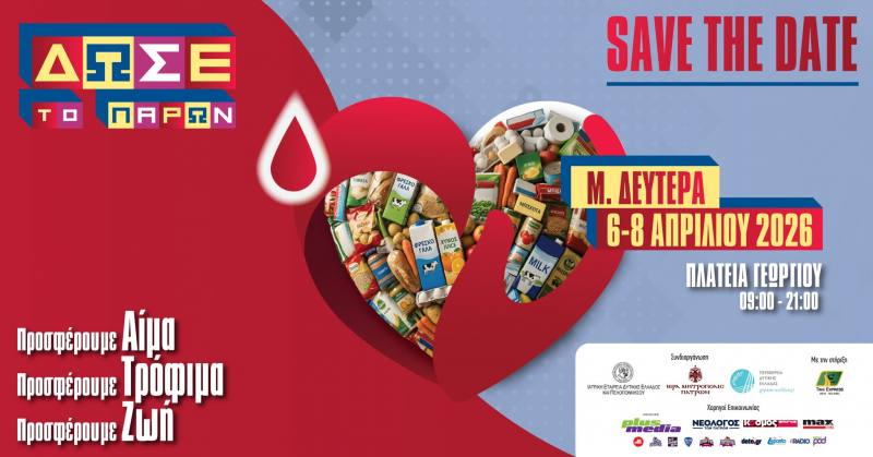 «ΔΩΣΕ ΤΟ ΠΑΡΩΝ ’26 – Προσφέρουμε Αίμα, Προσφέρουμε Τρόφιμα, Προσφέρουμε Ζωή» την Μεγάλη Τρίτη 7/4 στην Πλατεία Γεωργίου