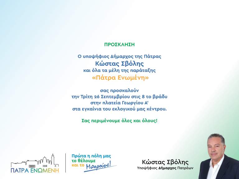 Ο υποψήφιος Δήμαρχος της Πάτρας Κώστας Σβόλης και όλα τα μέλη της παράταξης «Πάτρα Ενωμένη» σας προκαλούμε την Τρίτη 26 Σεπτεμβρίου και ώρα 8μ.μ. στα εγκαίνια του εκλογικού μας κέντρου στην πλατεία Γεωργίου Α΄. Σας περιμένουμε όλες και όλους!