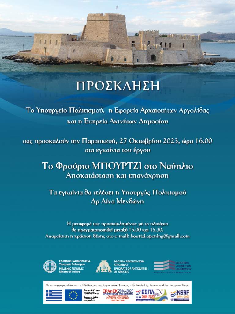 Το Υπουργείο Πολιτισμού, η Εφορεία Αρχαιοτήτων Αργολίδας και η Εταιρεία Ακινήτων του Δημοσίου σας προσκαλούν την Παρασκευή, 27 Οκτωβρίου 2023, ώρα 16.00 στα εγκαίνια του έργου Το Φρούριο ΜΠΟΥΡΤΖΙ στο Ναύπλιο Αποκατάσταση και επανάχρηση (2014-2021) Τα εγκαίνια θα τελέσει η Υπουργός Πολιτισμού Δρ Λίνα Μενδώνη