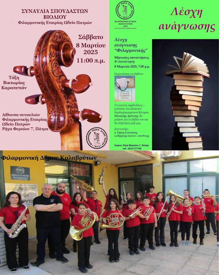 Στην Αίθουσα Συναυλιών της Φιλαρμονικής Εταιρίας Ωδείο Πατρών, διοργανώνονται τρεις εκδηλώσεις για το Σάββατο 8 και Κυριακή 9 Μαρτίου ως εξής: