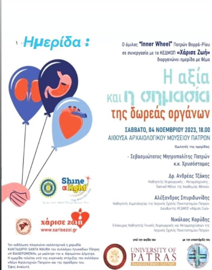 Ο Ομιλος Inner Wheel Πατρών Βορρά Ρίου σε συνεργασία με το ΚΕΔΜΟΠ Διοργανώνει ημερίδα με θέμα//Η Αξία και η σημασία της Δωρεάς Οργάνων//