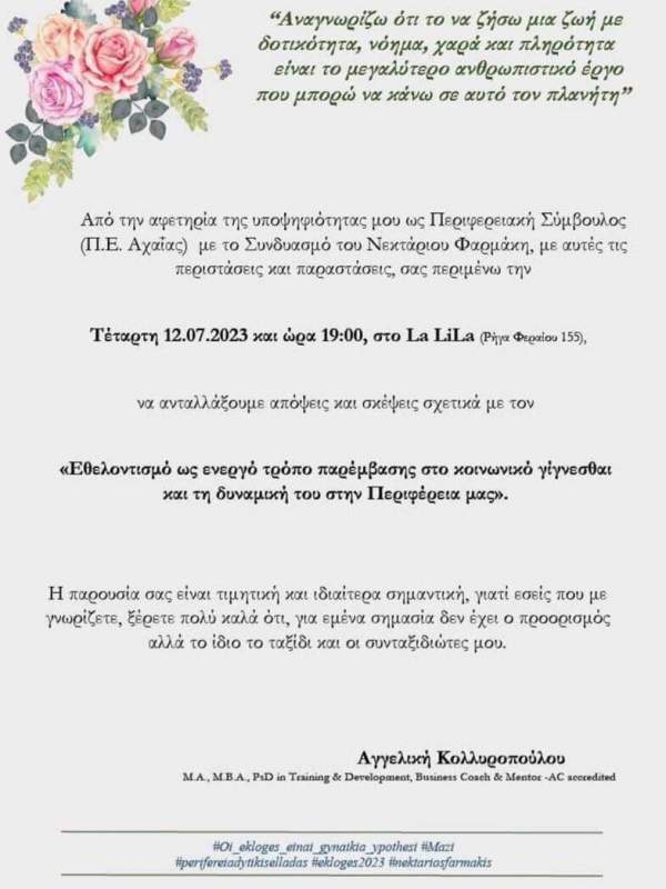 Εκδήλωση πραγματοποιεί στην Πάτρα αύριο, Τετάρτη 12 Ιουλίου 2023, η Αγγελική Κολλυροπούλου, υποψήφια στις περιφερειακές εκλογές του Οκτωβρίου με τον συνδυασμό του Νεκτάριου Φαρμάκη.