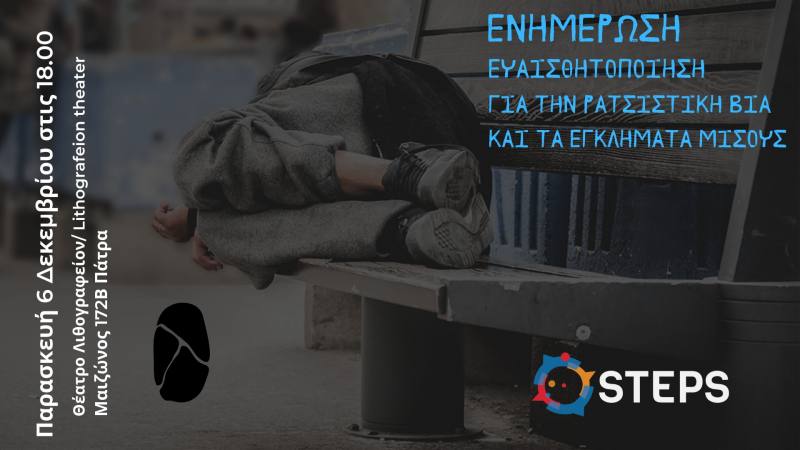 Η STEPS με την στήριξη του Ιδρύματος Roza Luxemburg- παράρτημα Ελλάδας διοργανώνει ενημερωτική εκδήλωση με θέμα «Ενημέρωση και ευαισθητοποίηση γύρω από τη ρατσιστική βία και τα εγκλήματα μίσους» την Παρασκευή, 6 Δεκεμβρίου 2024, στις 18:00, στο Θέατρο Λιθογραφείον, Μαιζώνος 172Β στην Πάτρα.
