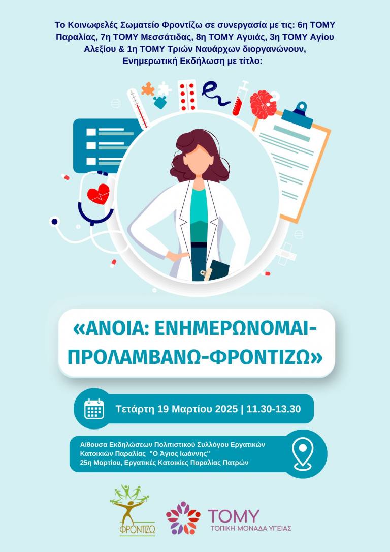 Το Κέντρο Ημέρας για Άτομα με Άνοια στην Πάτρα του σωματείου Φροντίζω σε συνεργασία με τις: 6η ΤΟΜΥ Παραλίας, 7η ΤΟΜΥ Μεσσάτιδας, 8η ΤΟΜΥ Αγυιάς, 3η ΤΟΜΥ Αγίου Αλεξίου & 1η ΤΟΜΥ Τριών Ναυάρχων, πρόκειται να διοργανώσουν την Τετάρτη 19 Μαρτίου 2025, και ώρες 11.30-13.30, ενημερωτική εκδήλωση με τίτλο: «ΑΝΟΙΑ: Ενημερώνομαι-Προλαμβάνω-Φροντίζω», στο πλαίσιο της οποίας πρόκειται να ανακοινωθεί η συνεργασία μεταξύ των φορέων για στοχευμένες δράσεις πρόληψης, έγκαιρης διάγνωσης και διαχείρισης της άνοιας και της νόσου Alzheimer στην τοπική κοινότητα.