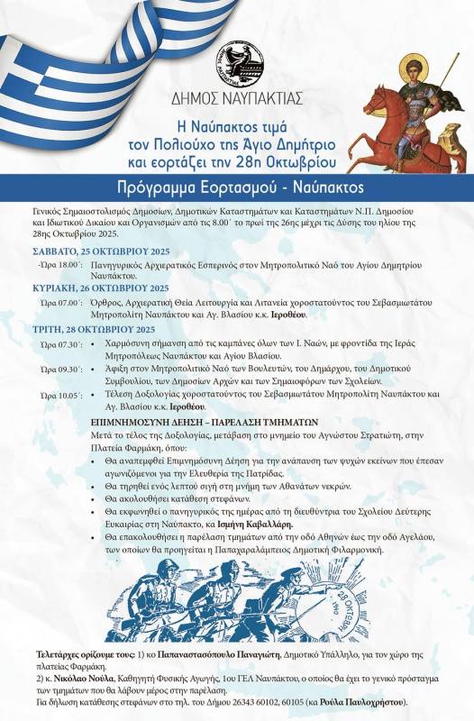 🔛Ο Δήμαρχος Ναυπακτίας κ.Βασίλειος Γκίζας και το Δημοτικό Συμβούλιο σας προσκαλούν στις εκδηλώσεις για τον εορτασμό του Πολιούχου της Ναυπάκτου, Αγίου Δημητρίου και της Εθνικής Επετείου της 28ης Οκτωβρίου.