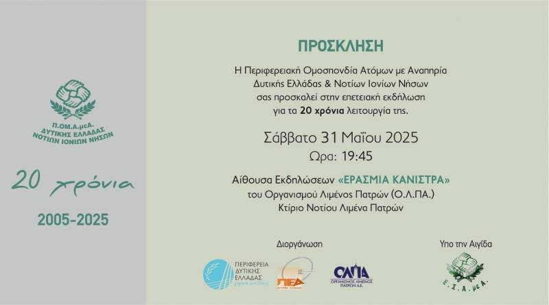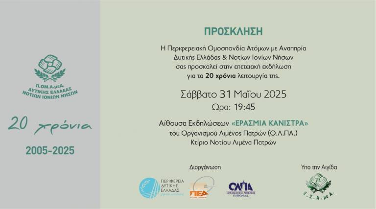Η Περιφερειακή Ομοσπονδία Ατόμων με Αναπηρία Δυτικής Ελλάδας & Νοτίων Ιονίων Νήσων σας προσκαλεί στην επετειακή εκδήλωση για τα 20 χρόνια λειτουργίας της.