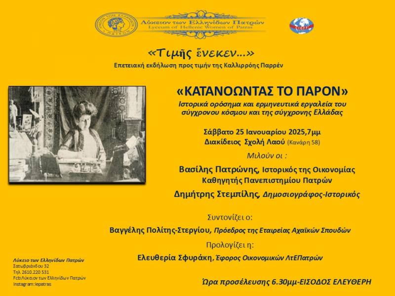 Θέλοντας να τιμήσουμε την Καλλιρρόη Παρρέν, αλλά και παίρνοντας παράδειγμα από τον απλό, μεστό και έγκυρο τρόπο με τον οποίο εκείνη παρουσίαζε ακόμα και τα πιο σύνθετα θέματα στο αναγνωστικό κοινό της «Εφημερίδας των Κυριών», διοργανώνουμε μια εκδήλωση-συζήτηση το Σάββατο 25 Ιανουαρίου2025,ώρα 7μμ στην Διακίδειο Σχολή Λαού (Κανάρη58, Πάτρα) με τον τίτλο: