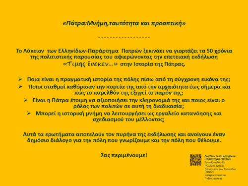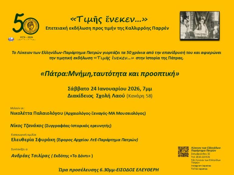 Το Λύκειον των Ελληνίδων-Παράρτημα Πατρών ξεκινάει να γιορτάζει τα 50 χρόνια της πολιτιστικής παρουσίας του αφιερώνοντας την επετειακή εκδήλωση «Τιμῆς ἕνεκεν…» στην Ιστορία της Πάτρας.