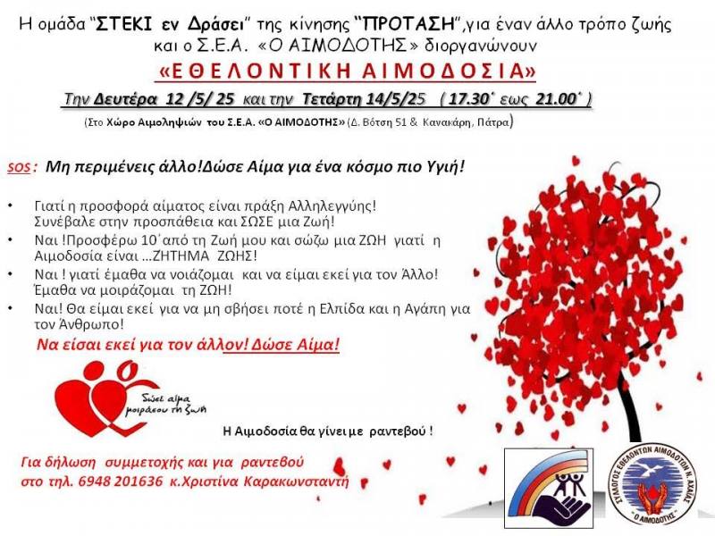 Η ομάδα «ΣΤΕΚΙ εν Δράσει» της κίνησης “ΠΡΟΤΑΣΗ” για έναν άλλο τρόπο ζωής και ο Σ.Ε.Α. «ΑΙΜΟΔΟΤΗΣ» διοργανώνουν: