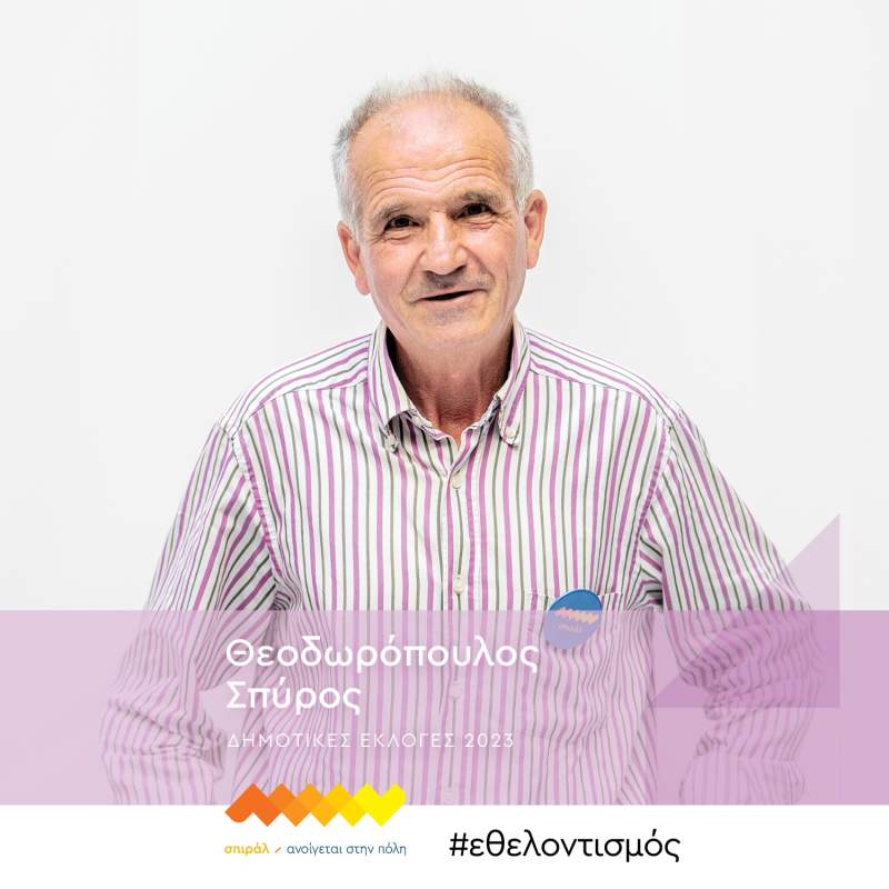 Ο Σπύρος Θεοδωρόπουλος γεννήθηκε το 1960 στην Πάτρα και κατοικεί στο Άνω Καστρίτσι. Φοίτησε σε σχολή του ΟΑΕΔ Πάτρας με την ειδικότητα του ηλεκτροσυγκολλητή και εργάστηκε σε ιδιωτικές εταιρίες, στο έργο της γέφυρας Ρίου – Αντιρρίου, αλλά και στην Αρχαιολογική Υπηρεσία.
