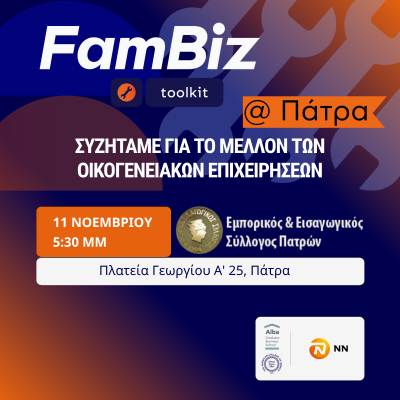 Την Τρίτη 11 Νοεμβρίου 2025, η Πάτρα υποδέχεται το “FamBiz Toolkit @ Πάτρα: Συζητάμε για το μέλλον των οικογενειακών επιχειρήσεων”, μια πρωτοβουλία της NN Hellas και του Alba Graduate Business School, The American College of Greece. Η εκδήλωση είναι μια συνδιοργάνωση με τον Εμπορικό και Εισαγωγικό Σύλλογο Πατρών και πραγματοποιείται στις εγκαταστάσεις του, υπό την αιγίδα του Επιμελητηρίου Αχαΐας και του ΣΕΒ Πελοποννήσου & Δυτικής Ελλάδας.