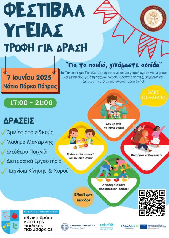Η Εθνική Δράση κατά της Παιδικής Παχυσαρκίας, που υλοποιείται από το Υπουργείο Υγείας σε συνεργασία με τη UNICEF και συντονίζεται από την επιστημονική ομάδα του Πανεπιστημίου Πατρών για την περιφέρεια της Δυτικής Ελλάδας, με επικεφαλής τον Ομότιμο Καθηγητή Υγιεινής του Ιατρικού Τμήματος, κ. Μιχάλη Λεοτσινίδη, σας προσκαλεί στο Φεστιβάλ Υγείας «Τροφή για Δράση», το οποίο θα πραγματοποιηθεί το Σάββατο 7 Ιουνίου 2025, από τις 17:00 έως τις 21:00, στο Νότιο Πάρκο Πάτρας.